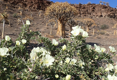 Wir befinden uns in der Übergangszone von den Trockengebieten zur Fynbos-Vegetation, gleichzeitig mit unterschiedlichsten Gesteinen die hier ihre eigene Landschaft formen. In Nieuwoudtville grenzen verschiedene Ökosysteme aneinander, die aus allen vier Himmelrichtungen einwirken. Im Nordosten ist es das Bushmanland, im Nordwesten ist es die Knersvlakte, die zur Sukkulentenkaroo gehört, im Westen liegt eine Gebirgsformation, das sogenannte Bokkeveld Plateau und von Süden her schwappen nördliche Ausläufer der Fynbosvegetation, genauer gesagt des Renostervelds, herüber. Aus dieser Mischung ist das Hantam-Roggeveld Endemismus-Center der ganz besonderen Art mit ca. 1350 Arten entstanden, in dem es weltweit die größte Dichte an Geophyten (ca. 300 Arten) gibt, also Zwiebel-, Knollen- und Rhizompflanzen. Sie ziehen sich zur Ruhezeit in den Erdboden zurück und kommen in der Regenzeit zusammen mit Massen von Einjährigen zur Blüte. Der Wandel der Vegetation und der Landschaften findet hier oben manchmal auf nur sehr wenigen hundert Metern statt.