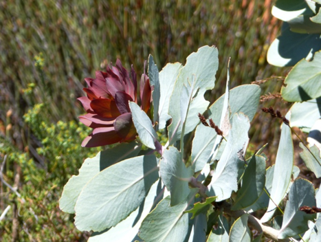 Protea nitida täuscht eine schöne rote Blüte vor ….