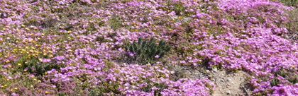 Es ist high noon, als wie den Strand nach etwa einer halben Stunde verlassen. Die Weiterfahrt währt nur kurz, denn violette Teppiche von Mesembs bedecken große Flächen, und wir halten an. Mittagsblumen, wohin das Auge auch schaut und erst bei genauem Hinsehen entdeckt man auch viel „Kleinzeug“ dazwischen, das von der Wucht der Farbe erst einmal erschlagen wird.