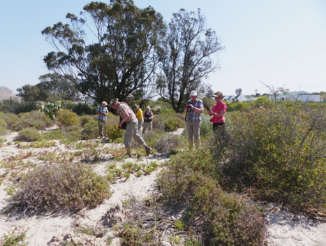 Schon nach ein paar Minuten nutzen wir die erste Möglichkeit, um an den Strand zu gelangen. Dort erwartet uns eine typische Strandveld-Vegetation und wir finden gleich wieder ein paar für uns neue Arten. Das Strandveld ist eine von fünf Unterabteilungen der Fynbosvegetation nördlich von Kapstadt. Die einzelnen Vegetationszonen sind einerseits höhen- andererseits bodenabhängig. Strandnahe Gebiete bestehen aus kalkreichem Sand einer früheren Meeresüberflutung mit vergleichsweise vielen Nährstoffen. Die anderen Fynbos-Typen haben entweder andere Böden wie Sandstein, Lehm oder Granit oder wegen ihrer topographischen Lage andere Niederschläge. Daher sind viele Arten lokal auf diese Lebensräume begrenzt, einige sogar endemisch.