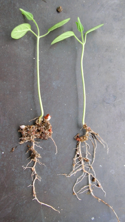 Zwei Sämlinge nach dem Austopfen. In keinem Falle war ein Ansatz für einen Caudex zu erkennen.