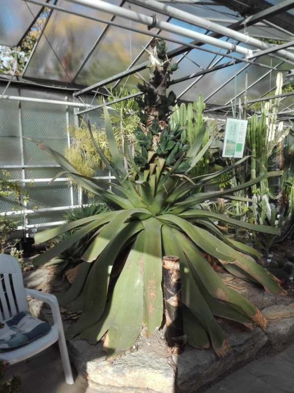 Bei uns im Kakteenhaus des Botanischen Gartens steht diese imposante Agave, deren Alter ich auf ca. 100 Jahre schätze. Seit 1955, zur ersten Bundesgartenschau, befindet sie sich in Kassel. Letztes Jahr begann sie ziemlich rasant ihre Blüte zu entwickeln, welche sehr schnell das Dach des Gewächshauses erreichte. Es wurde eine Scheibe raus genommen und die Spitze der Blüte provisorisch mit Luftpolsterfolie umwickelt. Da bereits Oktober war, war Eile geboten, da die Blüte schon eine Höhe von 7 m erreicht hatte. Dies ging durch die hiesige Presse und das HR-Fernsehen war, glaube ich, auch vor Ort. Unser Gartenamt hatte sich zu viel Zeit mit dem Aufbau einer provisorischen Hülle aus Holz oder Aluminium mit Kunststoffplatten gelassen. Schnelle Entscheidungen und Ämter funktionieren leider fast nie gut. Es kam, wie es kommen musste: -6° Nachtfrost und es war um die Blüte geschehen. :(