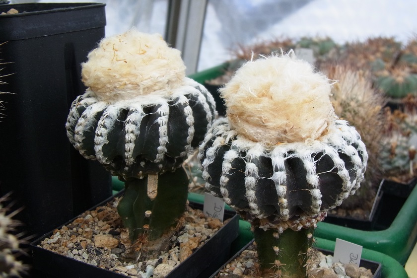 Die zweite stammt von M Halfar, dem die Pflanze wohl selbst nicht auf dem eigenen Verkaufstisch aufgefallen ist. Mir hat sie sofort ins Auge gestochen, durch Form und Farbe der Bedornung, anders gesagt, ihren Habitus. Auf den ersten Blick glaubte ich, es wäre wohl ein Gymnocalycium (das ist doch Deine Sparte), aber davon bin ich sehr schnell abgekommen. Ganz klar fällt sie aus dem Rahmen. Nun hat sie Scheitelwolle ausgebildet, was einen Discocactus erkennen lässt.
