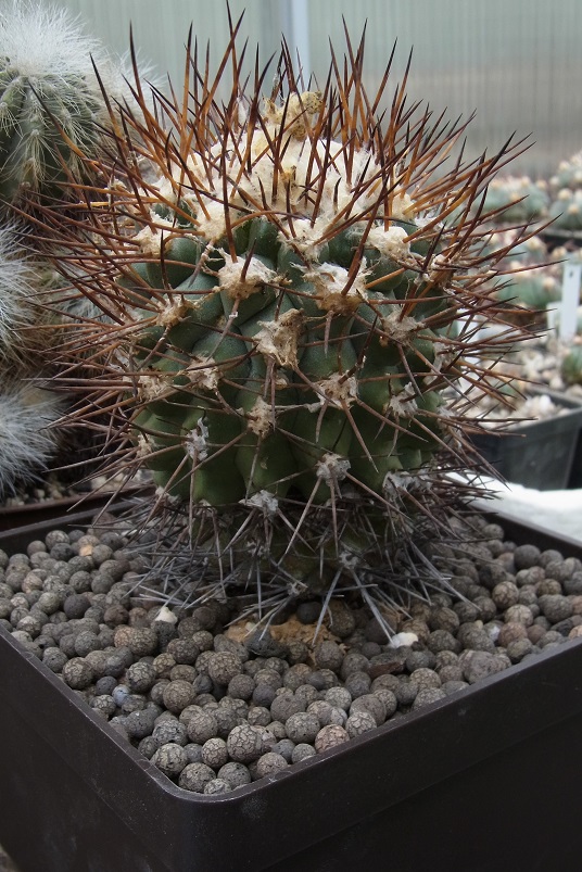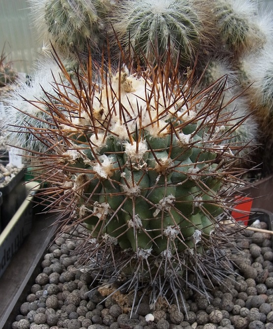 wo ich die Pflanze gekauft habe, ist mir sowas wie Copiapoa mollicula eingefallen, was meine Recherchen eher bestätigten. Copiapoa mollicule ist anscheinend auch variabel, ich vermute aber dass sich je nach dem Ernährungszustand das Bild etwas ändern könnte (ich bin im ersten Jahr immer sehr vorsichtig mit dem Gießen, aber ich vermute dieses Jahr sollte es besser gehen, die Pflanze zeigt gute Aktivität im Scheitelbereich). Eine "ähnliche" Art scheint auch Copiapoa pendicolor zu sein.
