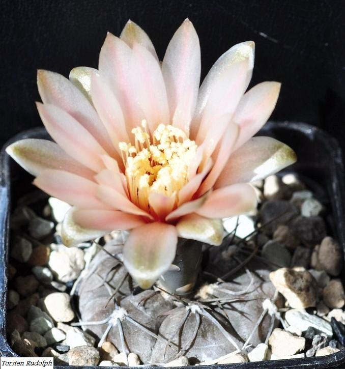 Hier ein kleines Gymnocalycium berchtii das zum ersten Mal blüht.