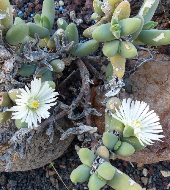 Bitte beachten: Thomas hat die Bilder in der Reihenfolge benannt, in der sie angezeigt werden; die Bilddateien sind aber genau umgekehrt nummeriert. So heißt z. B. die Datei der Faucaria spec. vom 4. angezeigten Bild "Mesemb 8.jpg", das 5. Bild (Fenestraria ist die Datei "Mesemb 7.jpg" usw.