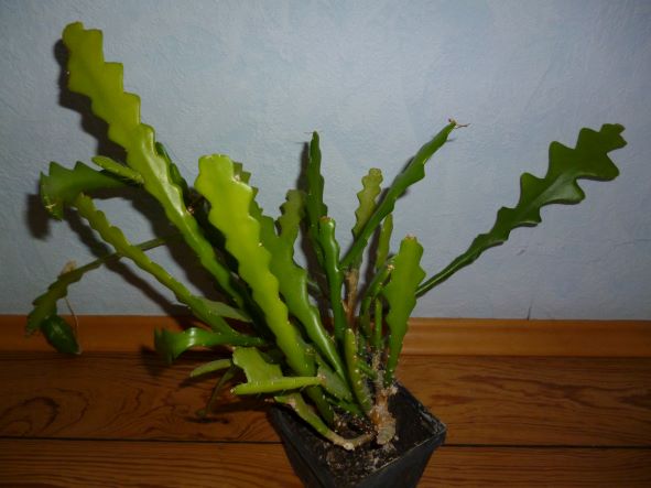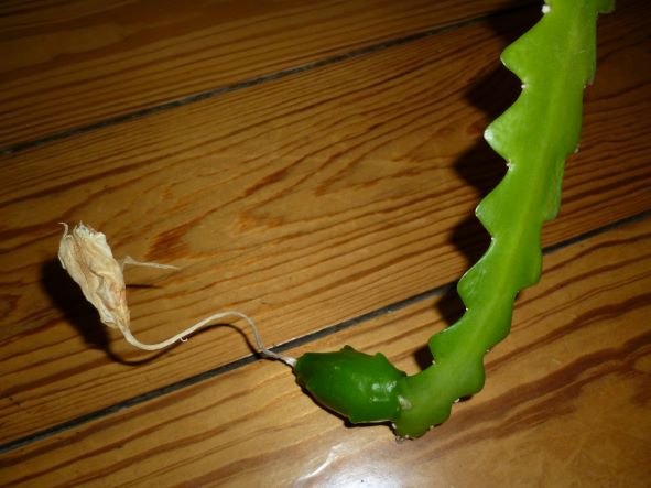 Ich habe die Pflanze aus Samen gezogen, die von der Firma Köhres als Cryptocereus anthonyanus angeboten wurden. Diesen Sommer ist nun die erste Blüte erschienen (cremeweiß, ca. 10 cm lang, ca. 5-7 cm breit, leider kein Foto). Die Blüte hat sich selbst bestäubt und eine Frucht gebildet. Weder die Blüte noch die Frucht stimmen aber mit der Beschreibung von Cryptocereus anthonyanus überein. Auch Disocactus/Epipyllum anguliger, das eine fast doppelt so große Blüte besitzt, passt nicht. Hat jemand eine Idee, was das sonst noch sein könnte?