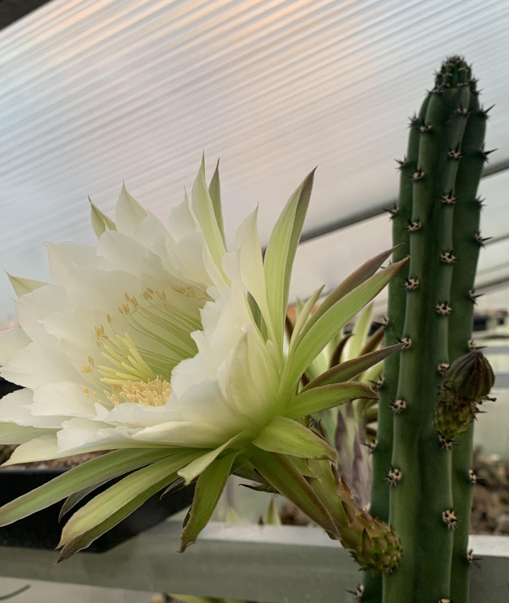 Meistens als Pfropfunterlage genutzt, macht dieser Kaktus auch als "normale" Pflanze etwas her und bei entsprechender Größe blüht diese Art auch sehr schön. Die Blüten gehen am Spätabend auf und mit etwas Glück sind sie am nächsten Morgen noch geöffnet. Derzeit blüht bei mir eine Pflanze: