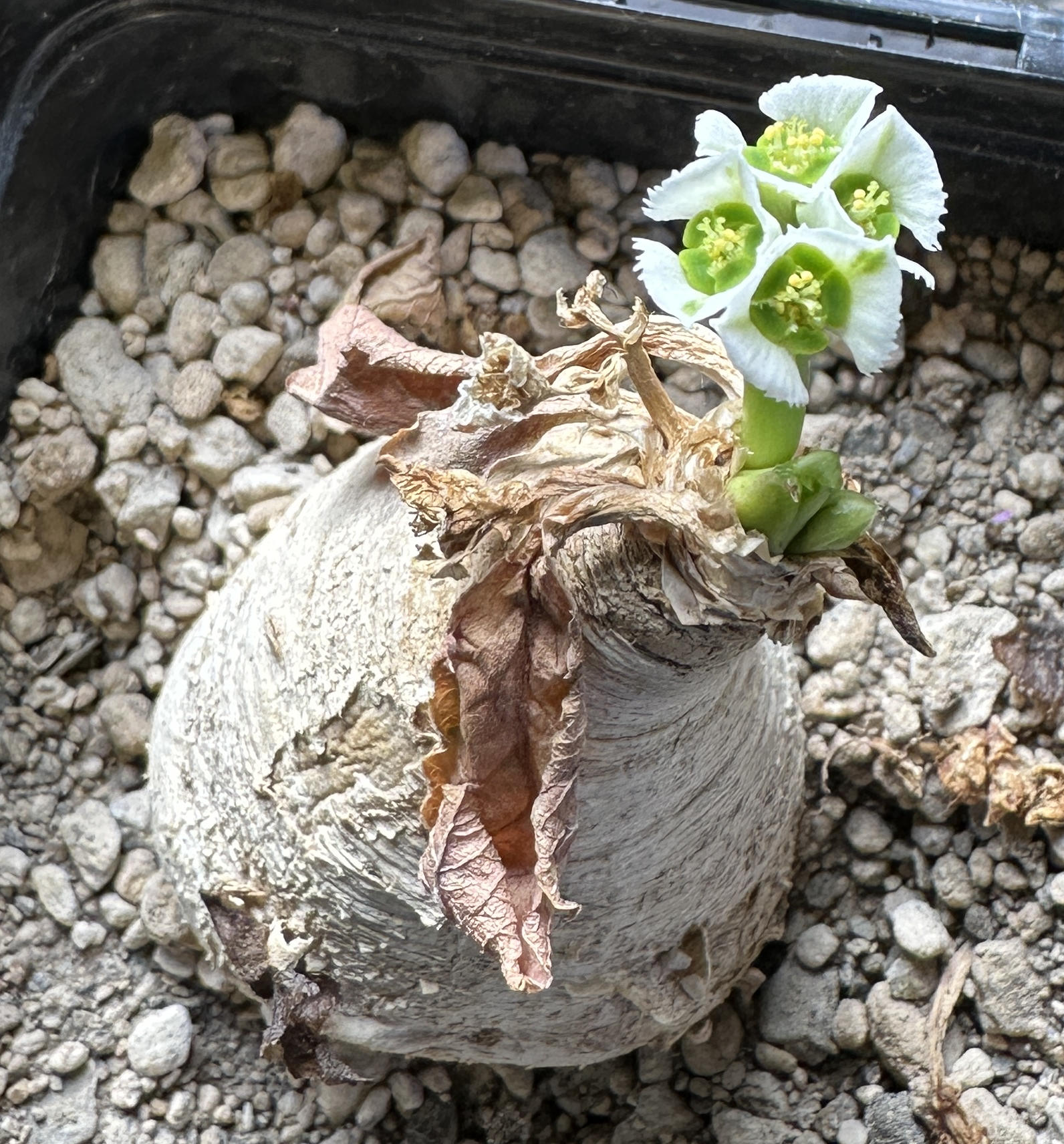 ja, blüht vor dem Laubaustrieb. Allerdings sind die Blüten sehr klein und schwer zu fotografieren. Und naja, es ist halt ein Caudex-Ding.