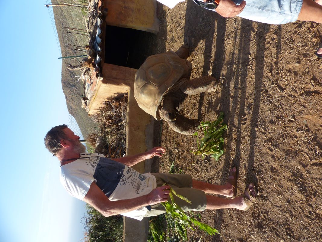 Jim brachte vor ca. 60 Jahren eine handtellergroße Schildkröte von den Seychellen mit, heute ein Riesentier. Es gibt dazu auch ein Weibchen.