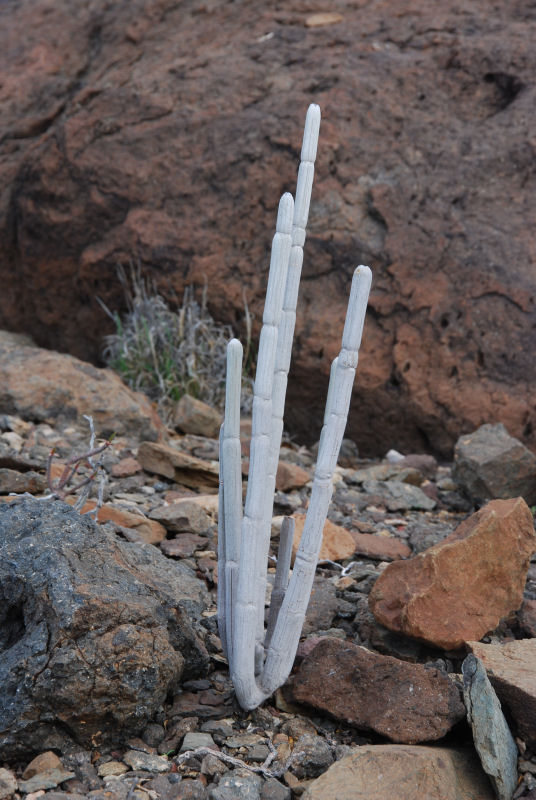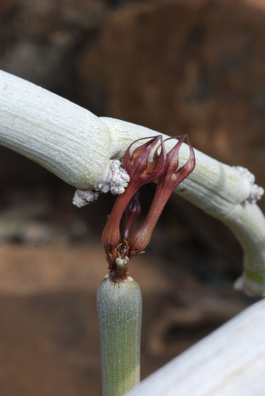 ... waren wir an einem küstennahen Standort, an dem Ceropegia fusca in erfreulich großer Zahl wächst. Das war der botanische Höhepunkt der Reise. Auf einem einzigen schottrig-trockenen Hügel in Gesellschaft von Euphorbia balsamifera, Lycium intricatum und Neochamaelea pulverulenta . Nach Eingewöhnung des "Suchauges" waren die weiß-grauen, etwa 1 cm dicken Triebe ohne Weiteres auf Entfernung auszumachen. Auf anderen Hügeln in der "Ecke", für uns eigentlich zum Verwechseln ähnlich, nichts zu finden. Stattliche Exemplare, teilweise in Blüte (dafür ist "offiziell" erst ab Februar bis März die richtige Zeit), aber auch jüngere. Traumhaft! Ohne ortskundige Hilfe hätten wir allerdings diese Nadel im Heuhaufen nie gefunden! Ein paar Bilder habe ich Euch mitgebracht: