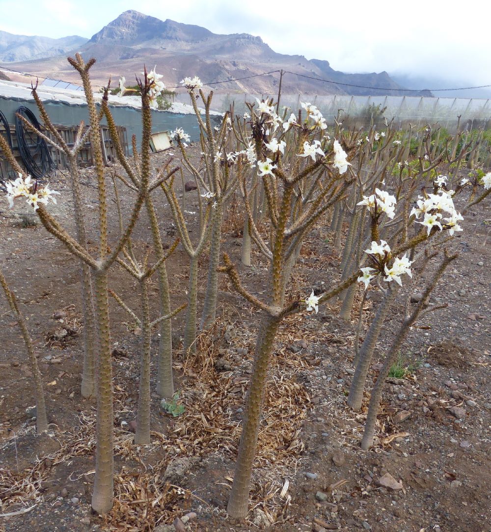 Seit 2024 blühen diese Pachypodien das erste Mal im Winter; Pflanzen ohne Blätter, Fotos März 2025.