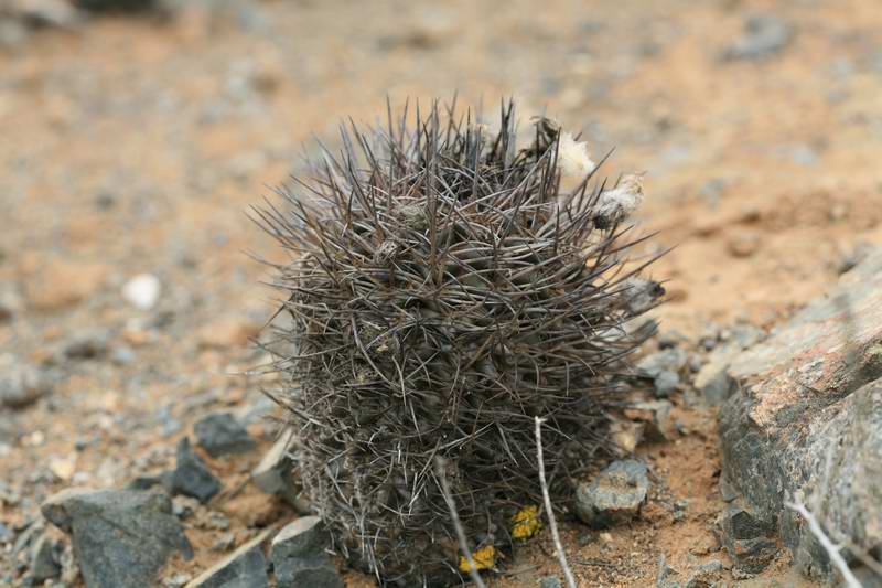 hier nun die nächste Pflanze. Ebenfalls vom Morro Moreno (W Antofagaste) aus rund 850 mNN aus einer Sattellage mit viel Feinmaterial. Sie nun relativ häufig, allerdings während des gesamten Aufstieges sonst nirgends vorhanden. Sie erreicht eine Höhe von bis 10-12 cm in geschützten Lagen z.B. unter Büschen. Die Bedornung ist ziemlich variabel.