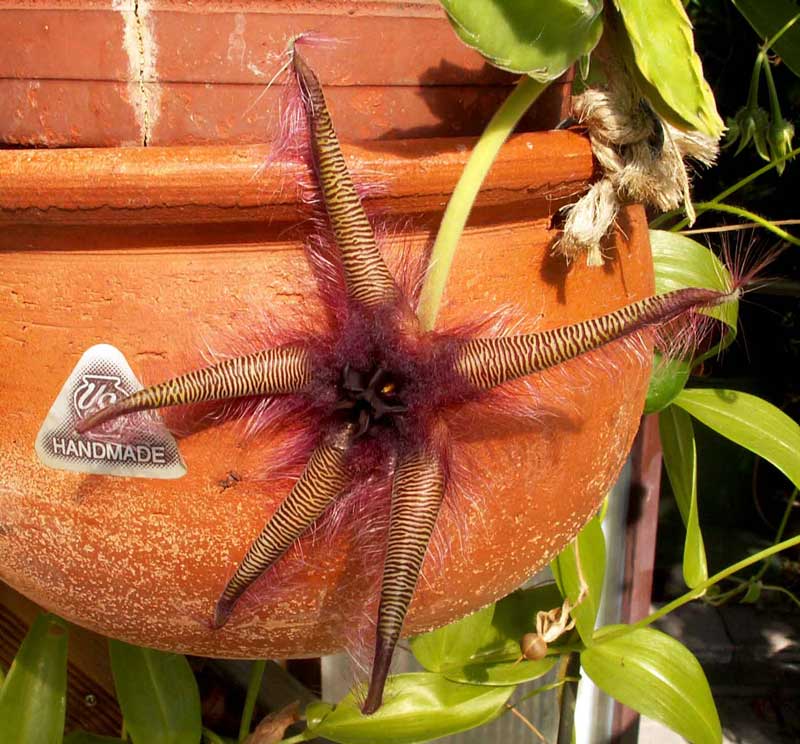 Stapelia gettliffei - besonders schöner Clone.Ist mir bis auf ein Stamm fast gestorben- hat sich aber wieder zu einer schönen Pflanze entwickelt und ich rechne dies jahr mit neuen Blüten.