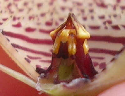 Staminale Nebenkrone mit nach innen gebogenen, mäßig stumpfen, gelben, zur Spitze hin graubraun angelaufenen Cs-Zipfeln, welche das Gymnostegium nur wenig überragen und sich in der Mitte berühren, Kuppe des Gymnostegiums in 5 helle Höcker geteilt, von den Cs-Zipfeln größtenteils verdeckt, Gleitschienen gelb, nur in der oberen Hälfte des Gymnostegiums angelegt.