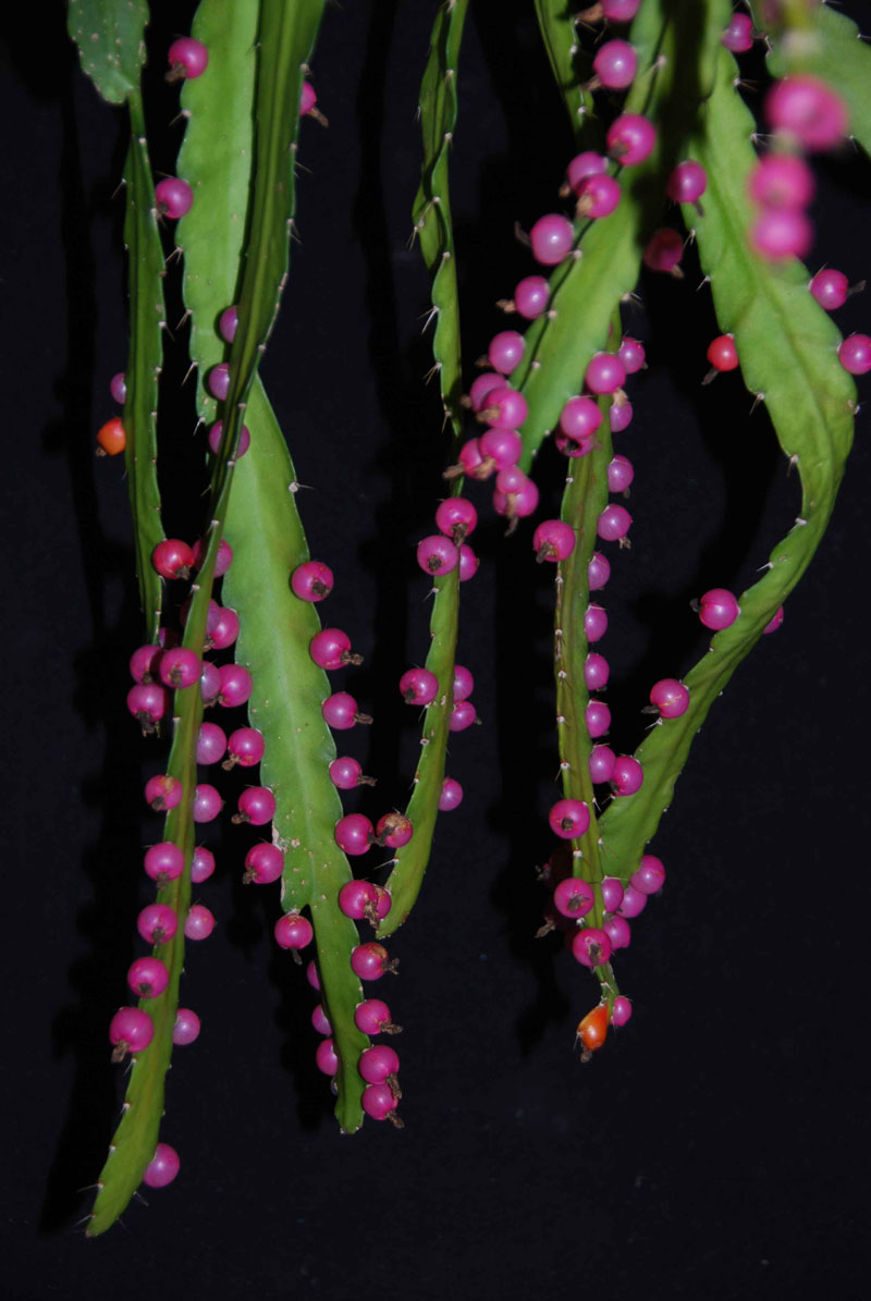 Pfeiffera monacantha (= Lepismium monacanthum, Rhipsalis monacantha) hat dieses Jahr bei mir reichlich mit den leuchtend orangefarbenen Blüten geblüht und zeigt jetzt seine pinkfarbigen Früchte. Diese bleiben 2-3 Monate erhalten bevor sie abfallen und eintrocknen.