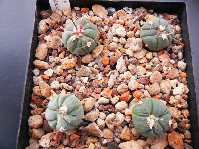das ist eine Frage, über die wir auch schon oft nachgedacht haben. In den großen Pflanzen, so ab 7 - 8 cm Größe haben wir Blütenreste gefunden oder je nach Jahreszeit auch seltener Blüten. Aber an kleineren Pflanzen nicht. Die wenigen blühfähigen Pflanzen und die Sämlinge werden auf dem Hängebrett bei möglichst viel Licht und Sonne kultiviert. Sämlinge wachsen sehr langsam, ein 3 cm Sämling macht vielleicht 2 Areolen Jahr. Gepfropfte Sämlinge auf Pereskiopsis wachsen schneller, meine aus 2007 sind 3 - 4 cm groß und haben zum Teil stark gesproßt, siehe auch Forum "Kultur und Pflege" und .........Vogelsand. Überwinterung erfolgt bei mir bei ca. 12 - 15 ° C.