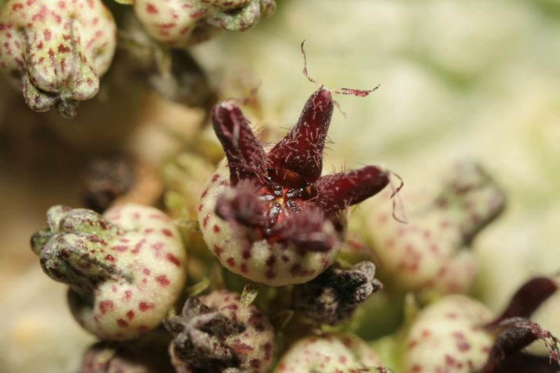 Beschreibung: Pflanze pyramidal, vierrippig, bis 6 cm hoch, 4-6 cm Durchmesser (in Kultur größer). Blütenstand (2-)4-10-blütig. Blütenröhre ca. 2,3-3 mm im Durchmesser, Blütenblätter ca. 1-1,5 mm lang, innen purpur bis kastanienrot, außen dunkelgrün mit purpurnen Flecken. Fruchtbalg ca. 20 mm lang. Samen dunkelbraun mit hellbraunem Rand.