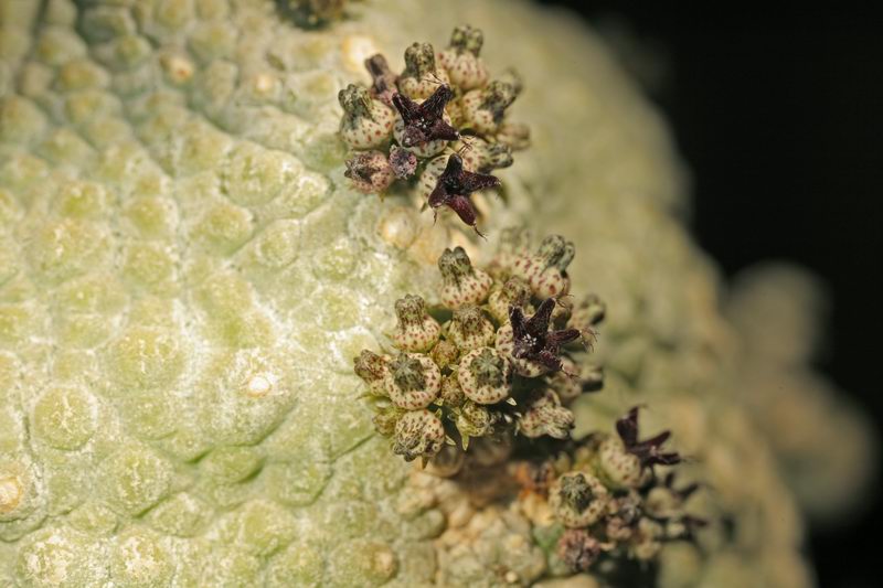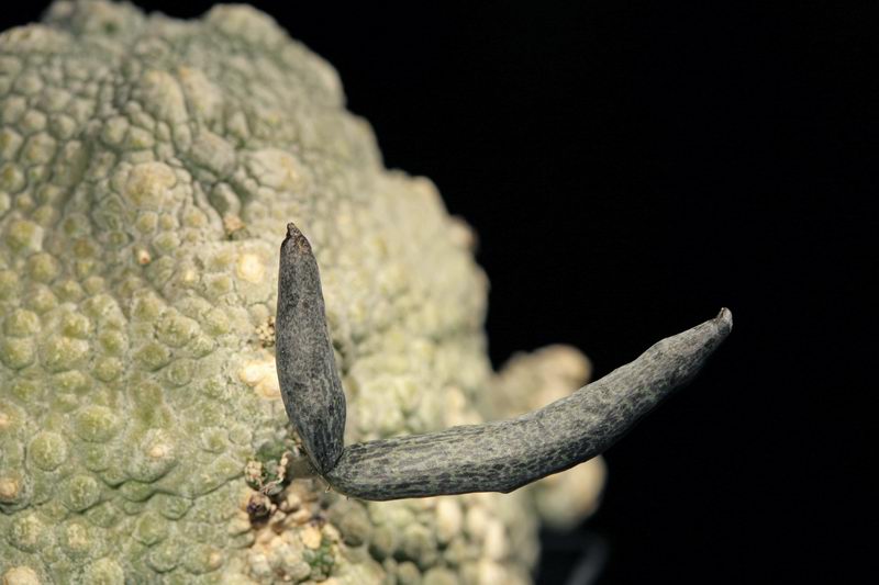 Friederike ist es vor zwei Jahren das bislang einzige Mal gelungen, eine Frucht an den sehr kleinen Blüten zu erzeugen. Das Bild unten dürfte sicher das einzige sein, das bislang jemals veröffentlicht wurde.