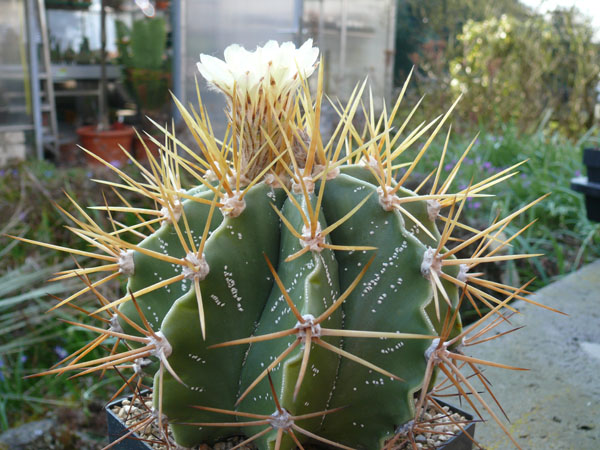 Die Pflanze steht hoch unter Glas auf der Hänge im vollen Sonnenlicht, dementsprechend ist auch die Bedornung und deswegen können sich auch die Blüten nicht vollständig öffnen. Schön an dieser Pflanze ist die honiggelbe Bedornung, ich habe auch noch andere Pflanzen mit brauner und noch stärkerer Bedornung, aber bisher ohne Blüten. Astrophytum ornatum wächst gut in rein mineralischem Substrat mit Lehmzusatz, aber recht langsam.