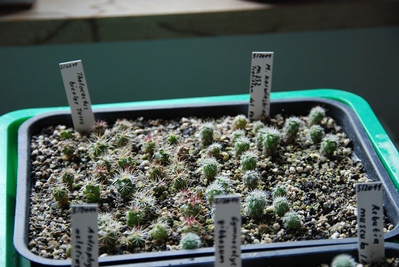 Ich habe mich dann auch dazu entschieden die Kleinen über den Winter warm durchzukultivieren, ich glaube um sie kühl und trockener zu überwintern war der Mai einfach ein zu später Aussattermin. In den ganz kurzen und dunklen Wintertagen zwischen Dezember und Februar habe ich dann auch teils mit einer Leuchtstoffröhre ein wenig zusätzlich Beleuchtet, hat den Kleinen scheinbar nicht geschadet. Trotzdem konnte ich im Winter einen Wachstumsstopp beobachten und hab dann die Substratoberfläche auch immer mehr zwischen dem giesen abtrocknen lassen. Dabei sind bei fast allen Arten immer mal wieder einzelne Kandidaten vertrocknet. Iich muss sagen oft schneller als man schauen konnte, oft innerhalb eines Tages. Vielleicht war die Luft durch die Heizung in der Nähe aber auch einfach zu trocken:-) Bei den Astros war es meist genau andersherum, bei denen ist immer mal wieder direkt nach nach dem giesen einer matschig geworden und daran eingegangen.