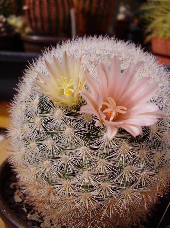 Durch die Wärme der letzten 2 Wochen legen die Blüten los. Heute ist mir eine Mammilaria Candida aufgefallen, die 2 Blüten untershiedlicher Farbe hat. Habe Bilder mit beiden Farben im Internt gefunden, aber an einer Pflanze?