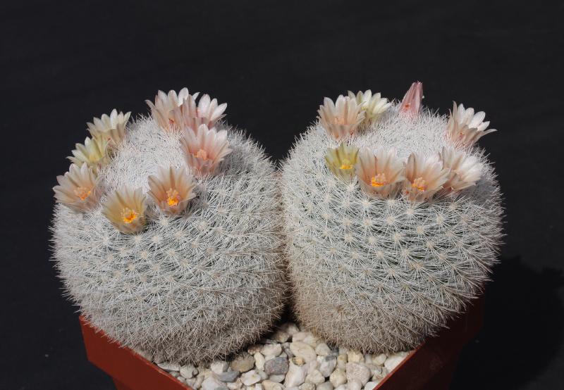 Hier ein Bild von meiner M. candida. Auch hier sind die verschiedenen Farbtöne zu sehen. Die neuen, kleineren Blüten sind mehr gelblich, die älteren mehr rosa.