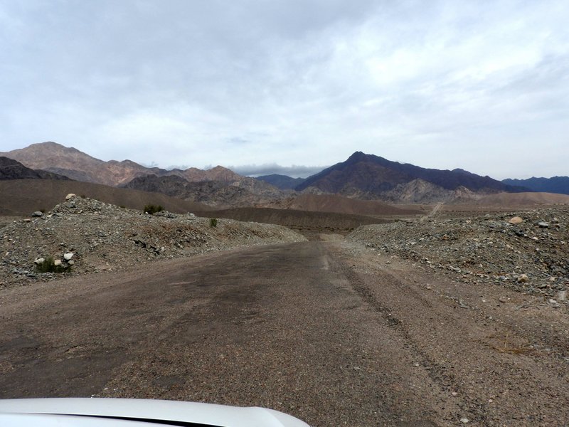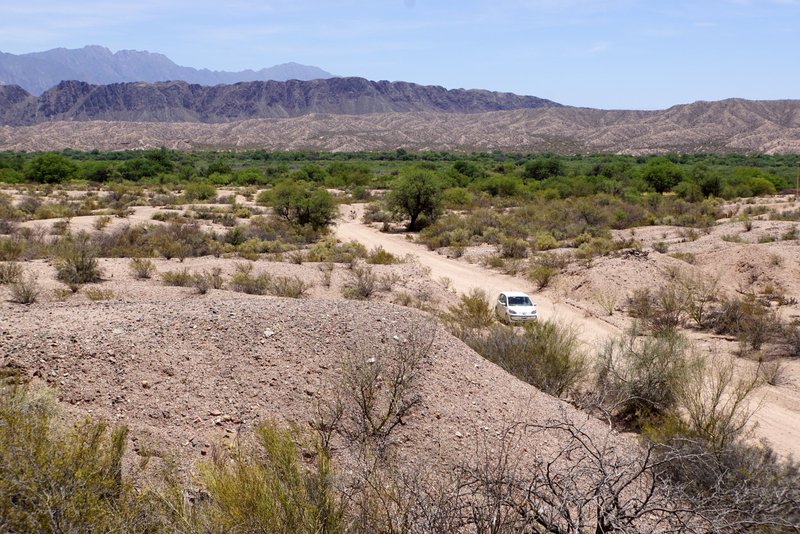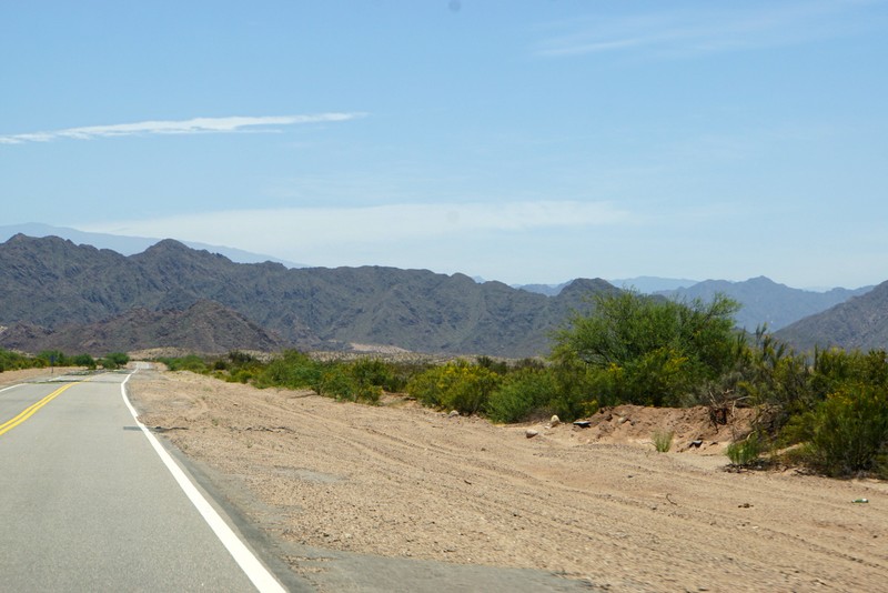 Nachdem wir die Kieshügellandschaft von Alpasinche, immer südlich des Cerro Negro passiert hatten, tauchen am Horizont im Westen die ersten Berge auf. Der Rio Colorado quert hier die südlichen Ausläufer der Sierra de Zapata. Die Straße folgt dem Flusslauf nach Tinogasta.