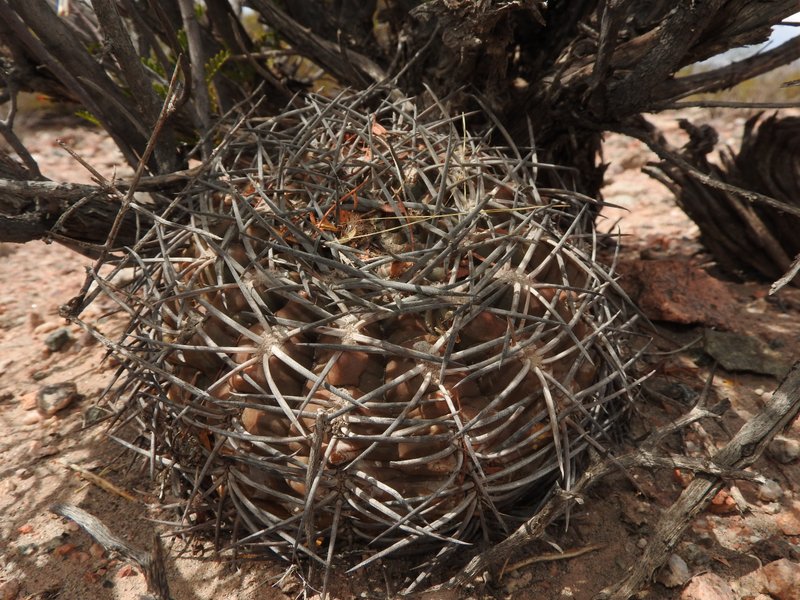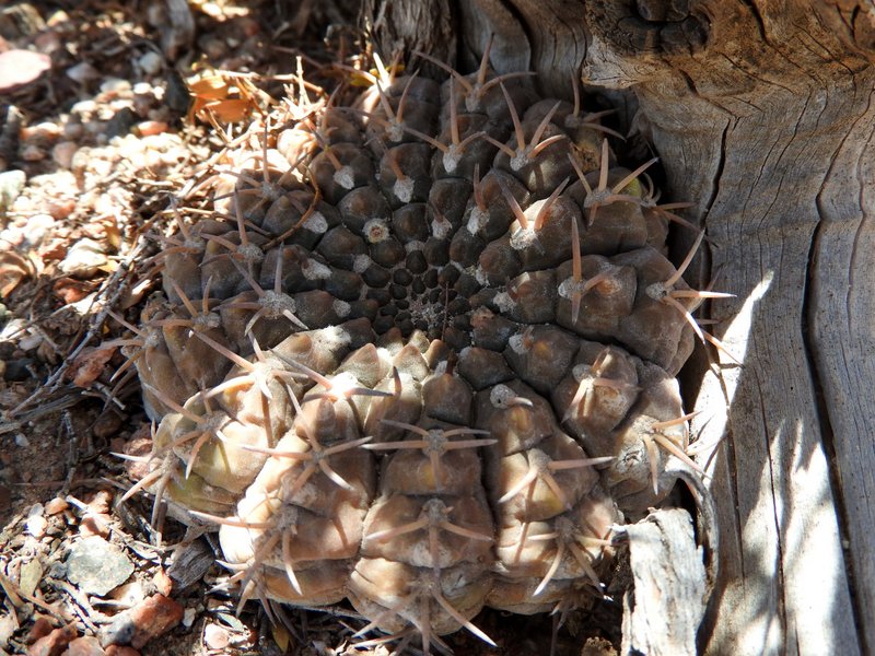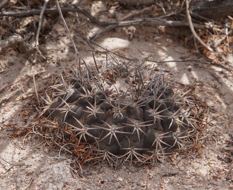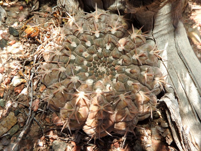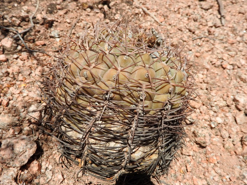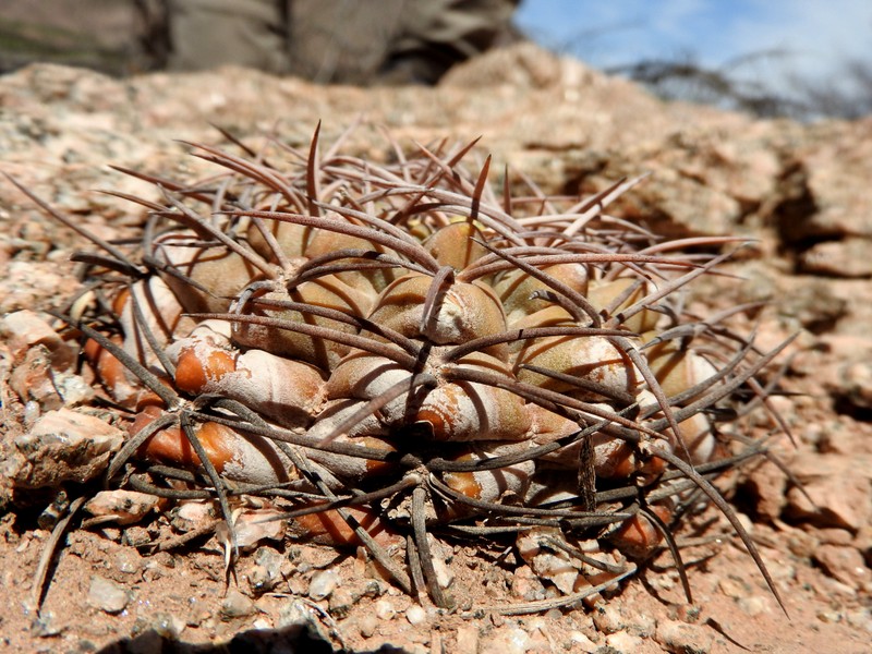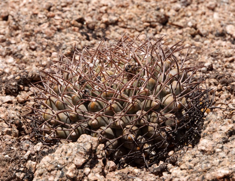 Kaum an den Felsen angekommen, beginnt die Suche nach Gymnocalycium glaucum. Die Pflanzen sind sicherlich eng mit G.mucidum verwandt, aber dennoch recht gut unterscheidbar, mal abgesehen von den völlig unterschiedlichen Habitaten. Einige Pflanzen erinneren mit ihrer Bedornung bereits an G.schmidianum.