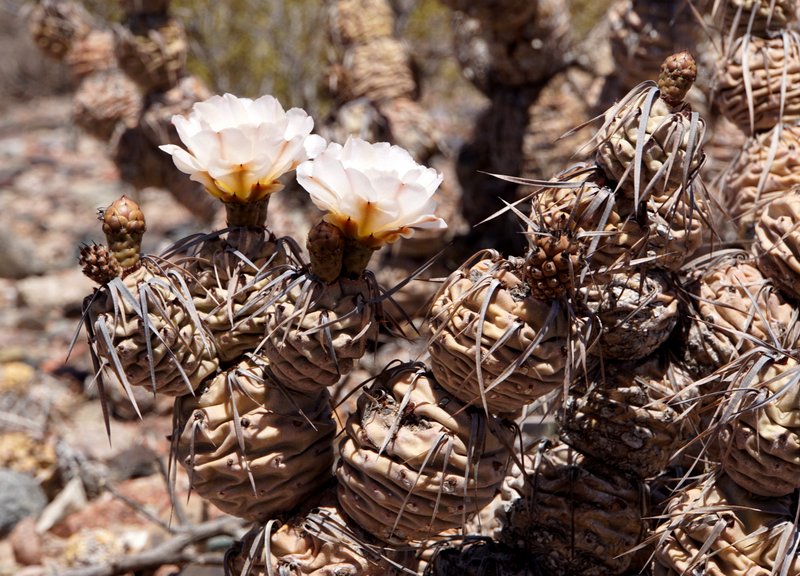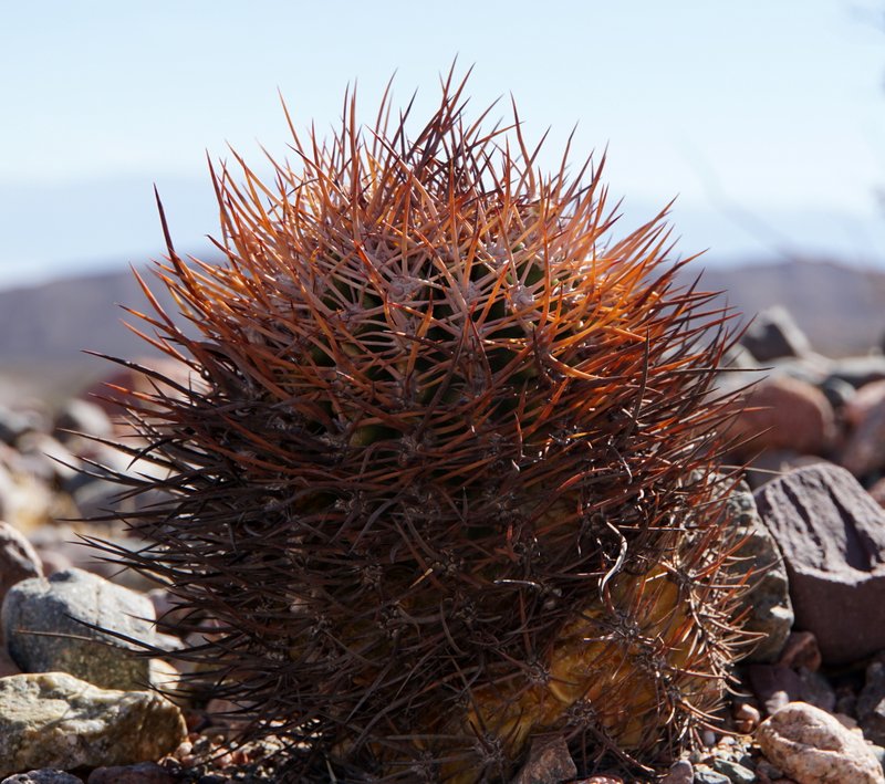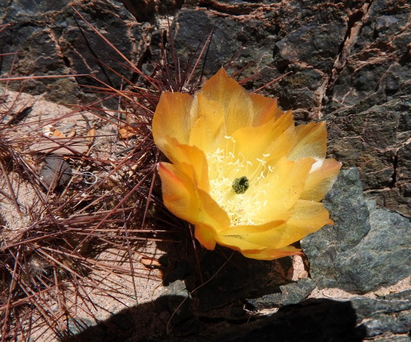 Tunilla soehrensii erfreut uns hier mit prächtigen, orange leuchtenden Blüten. Dank ihrer kräftigen gelben Bedornung machen die Pflanzen einen recht wehrhaften Eindruck in dieser kargen Landschaft.