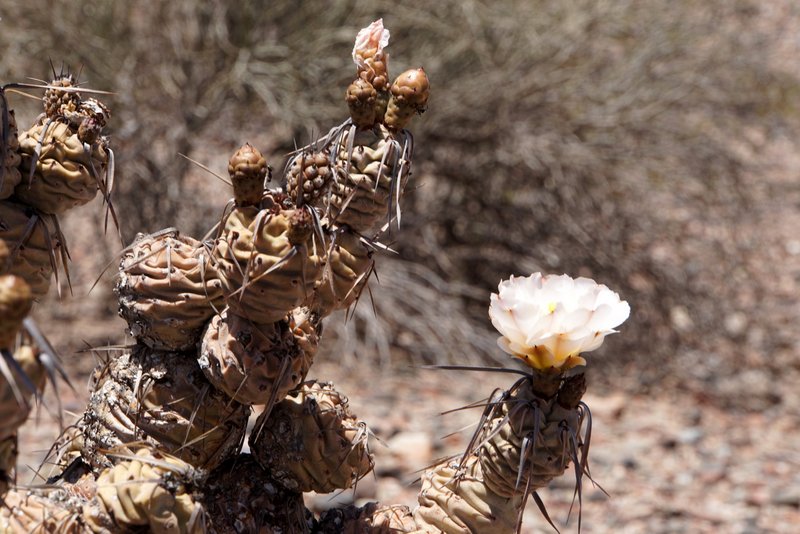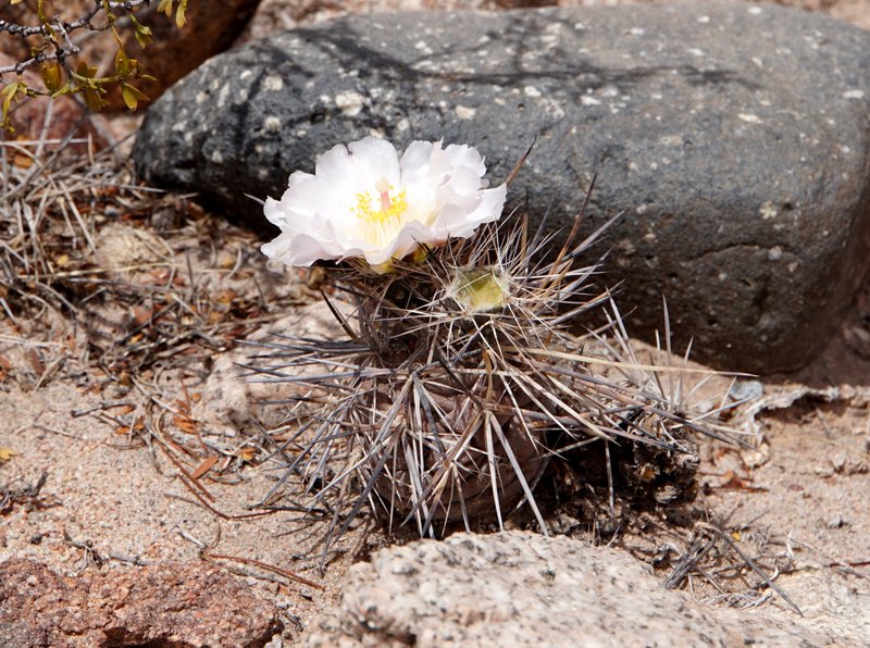 Auch die überfall zu findende Echinopis leucantha will da nicht hinten anstehen und zeigt auch am Tage ihre Blüten. Und wenn man sich die Sträucher genauer betrachtet, gibt es hier auch Cereus aethiops zu entdecken.