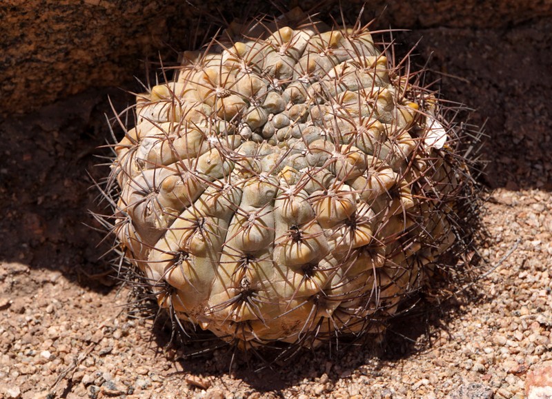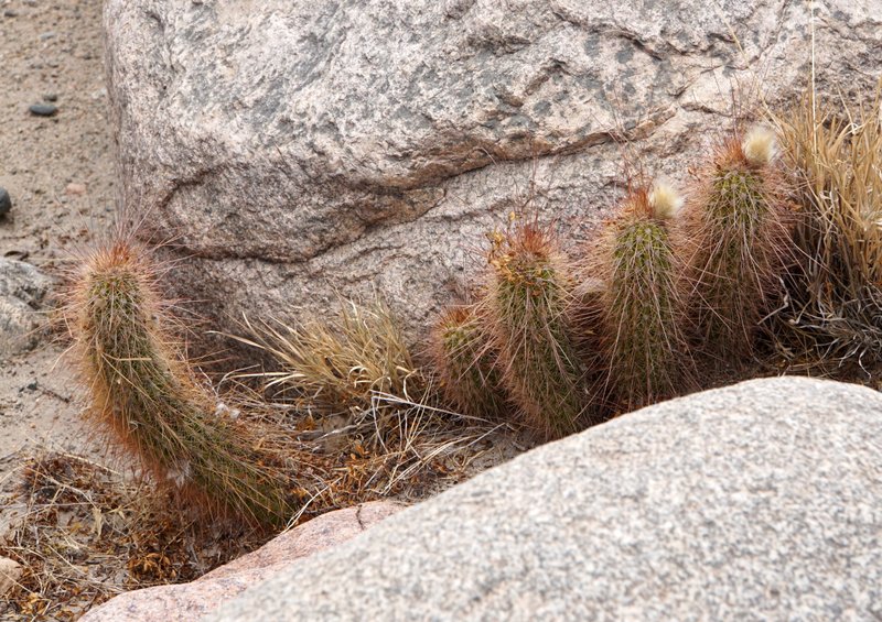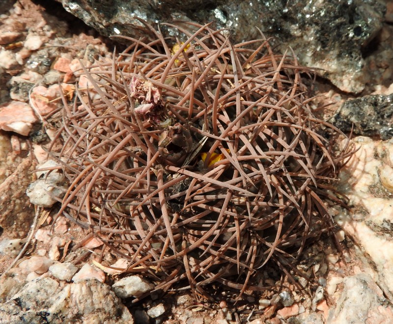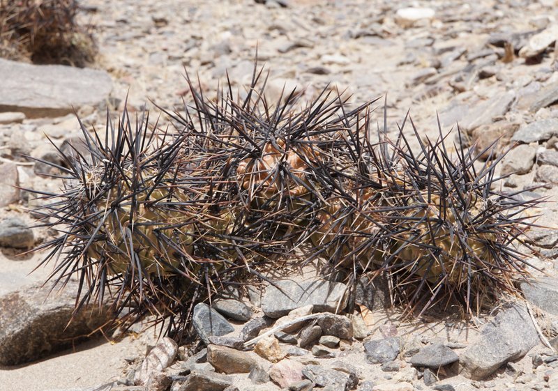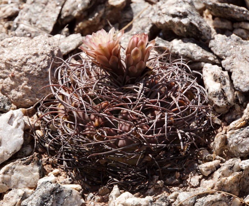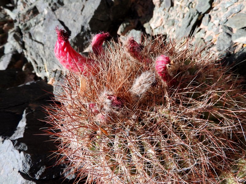 Wenig später beschließen wir, den kleinen Bach zu überqueren und die fast schwarzen Felsen der gegenüberliegenden Talseite zu erkunden. Das Erste was wir finden ist ein vermeintlich neues Gymnocalycium. Kann das sein in dieser Gegend und auf dieser Höhe? Erst später kommt die Erkenntnis, dass es sich um die Jugendform von Denmoza rhodacantha handelt. Aber seht selbst, Jugend- und Altersform unterscheiden sich doch recht gewaltig.