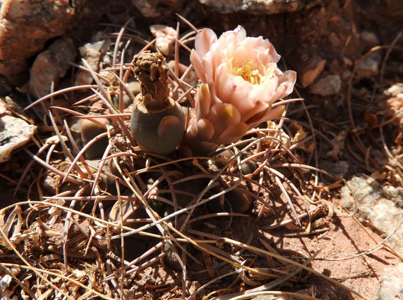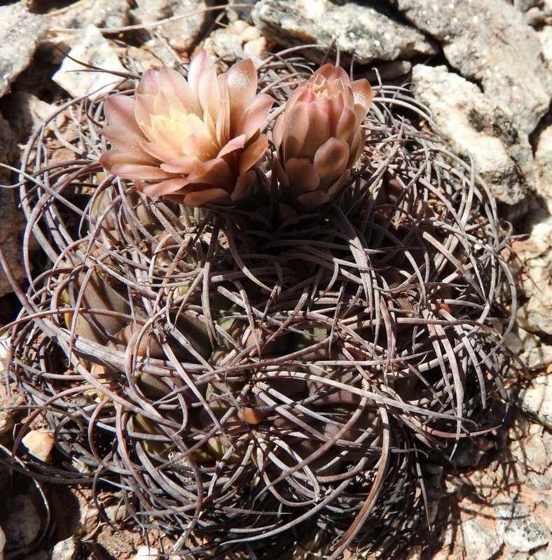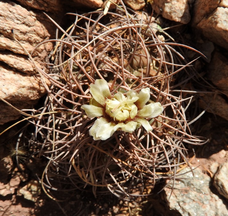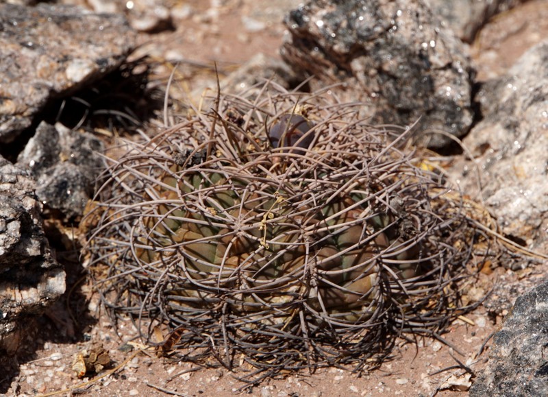 Weiter in Richtung Tinogasta finden wir die kleiner bleibenden, dafür kräftig bedornten Gymnocalycium schmidianum. Im Gegensatz zur Glaucum-Verwandschaft zeigen da einige auch ihre wenig spektakulären Blüten.
