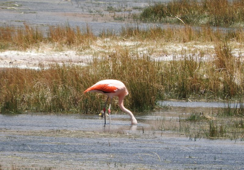 Weiter gehts auf der RN60 Richtung Pass. Die Straße macht nun einen Bogen nach Nordwest. Im Tal haben sich einige Sümpfe und offene Wasserstellen gebildet. Hier konnten wir Chileflamigos (Phoenicopterus chilensis), die häufigste der drei in Südamerika vorkommenden Flamingo-Arten beobachten. Eine andere Art begegnete uns dann etwas später.