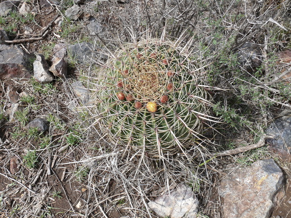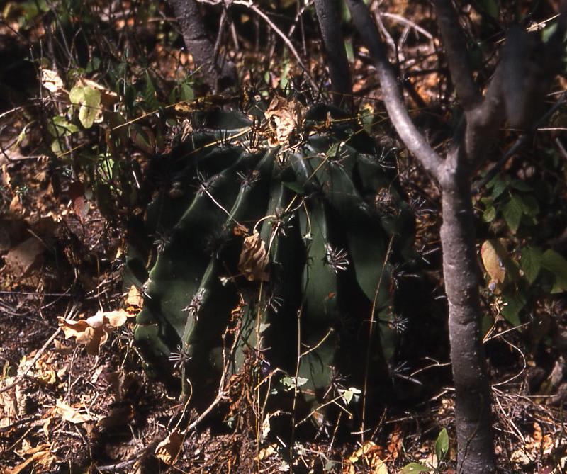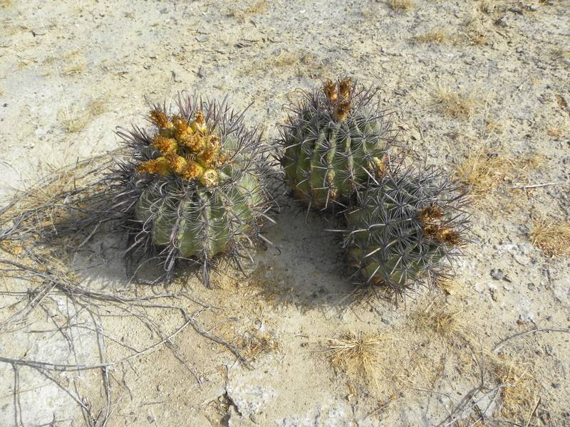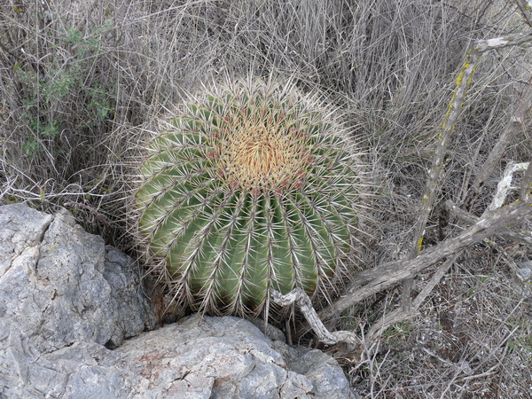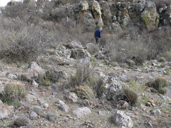 auf unserer letzten Reise durch Mexico kamen wir auf der Autopista von Zacatecas nach San Luis Potosi an einer Microonda, einer Antennenstation für Telekommunikation, vorbei. Da diese immer erhöht auf einem Berg oder Hügel stehen bogen wir in den Zufahrtsweg ab, um das Gelände zu untersuchen. Hier entdeckten wir neben einigen grünen Mammillarien auch diese dicken Ferocacteen. Ich nehme an, daß sie zu F. histrix gehören. Manfredo, bitte berichtige mich.