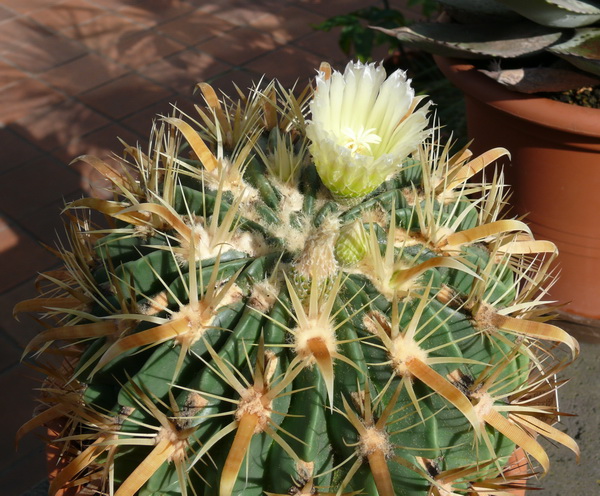 heute blüht auch wieder eine meiner beiden Feroc. latispinus var. flavispinus -Pflanzen. Zum Glück konnte ich eine der wenigen Wolkenlücken nutzen. Es handelt sich um eine Sämlings-Pflanze von 1986. Im Unterschied zu der von Kurt gezeigten Pflanze haben meine Pflanzen keine gehakten Mitteldornen.