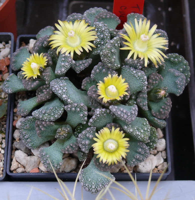langsam hört das Blühen im Gwh. auf. Als eine der letzten Pflanzen hat diese Titanopsis calcarea, die ich vor 3 Jahren in Belgien auf der ELK erstanden hatte, bei dem schönen Wetter die ersten Blüten geöffnet. Auf dem heutigen Bild sind schon 5 Blüten geöffnet und 2 Knospen sind noch in Wartestellung. Das Pflänzchen ist wirklich einfach in der Kultur, wie ist nachzulesen in den Vorgänger-Beiträgen.