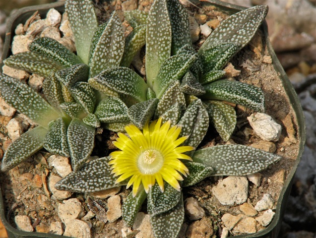 Die Wintertemperatur liegt bei 3 °C Minimum, wobei es in den letzten Jahren auch mal tiefer ging. Sie stehen unter Assimilationslicht mit den anderen Winterwachsern und erhalten gelegentliche Wassergaben, vorsichtig am Topfrand und in den Ecken. Meine Aloinopsis stehen alle in 13er Vierkanttöpfen (13 x 13 x 13) und füllen diese gut aus. Die Ruhezeit liegt im Sommer, etwa Juni bis August, ohne pralle Sonne und nicht total trocken. Sobald die Blätter etwas schrumpfen, gibt es wieder ein paar Schluck. Das tut den Pflanzen offensichtlich gut.