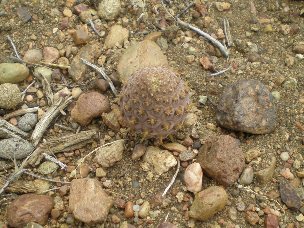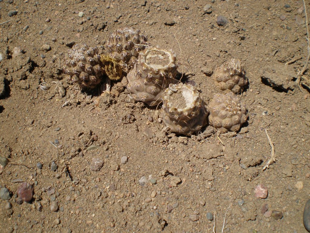 Eigentlich ein Pterocactus araucanus - dachte ich. Aber der sollte immer endständig blühen! Hier ist zwar nur eine Frucht zu sehen, aber ich habe inzwischen mehrere Wuchsorte dieser Pflanzen besucht und immer erscheinen die Früchte eben nicht endständig, während bei den klassisschen araucanus Wuchsorten die Früchte wirklich wie beschrieben immer endständig zu finden sind.
