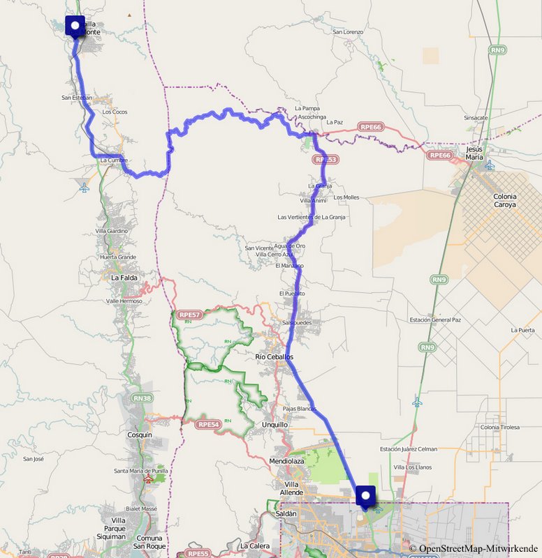 Als Ergänzung zu unserem ersten Tag noch eine Karte mit der Anfahrtsroute nach Capilla del Monte (Cordoba). Auch unsere erste Übernachtungstätte möchte ich euch nicht vorenthalten. Dieses nette Appartement (Dos Aquas) mit Poolblick, direkt am westlichen Ortsrand gelegen, war gerade richtig um die ersten drei Nächte zu verbringen. Ok, ich gebe es zu, vielleicht etwas unsportlich, ein Zelt hätte es schließlich auch getan. Aber nach der Nacht im Flieger ein perfektes Quartier.