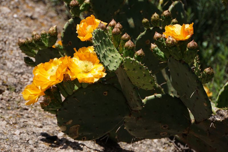 Ganz gemütlich die nähere Umgebung erkunden stand heute auf dem Programm. Auf einer recht passablen Piste ging es zunächst Richtung Stausee. Natürlich war die Ungeduld groß und so stürzten wir uns schon bald in das dichte Dornengebüsch. Wir waren gut vorbereitet und so wussten wir, was wir heute mit etwas Glück zu erwarten hatten. Die ersten Funde ließen nicht lange auf sich warten. Gymnocalycium mostii müsste es hier geben. Die kräftig bedornte und zum Sprossen neigende Form wird als G.valnicekianum bezeichnet. Die Blüten sind hier, westlich der Sierra Chica heller, dafür mit rötlichem Schlund. Egal wo man sich in Kakteengebiete begibt - Vertreter der Opuntioiden sind eigentlich immer präsent. Heute gab es gleich drei verschiedene Arten zu bestaunen. Besonders farbenprächtig in leuchtendem orangegelb präsentiert sich Opuntia elata. Die eher niederliegende Opuntia sulphurea hingegen verweigerte vorerst ihre Pracht, was sich aber im weiteren Verlauf bei dieser im Nordwesten Argentiniens extrem weit verbreiteten Art noch ändern sollte. Ein Zwerg ganz anderer Art, der allzu leicht übersehen wird, ist hingegen Austrocylindropuntia salmiana.