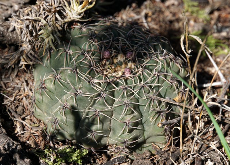 Bekannt ist, dass es im Bereich des Stausees Dique el Cajón Vorkommen von Gymnocalycium quehlianum geben müsste. Natürlich war es Pflicht, diese auch zu finden, zumal mir die Trichomosemineum besonders am Herzen liegen. Leichter gesagt als getan. Bestimmt gibt es problemlosere Bereiche diese Art zu finden - wir haben uns aber für die dornigste Variante entschieden. Etliche blutige Schrammen später wahr dann endlich das erste Exemplar gefunden. Auf dem ersten Foto ist zu erkennen, wie gut die Biester getarnt sind, nur der Blütenrest hat die Pflanze letztlich verraten. Hat man aber erst mal ein Exemplar gefunden, gesellen sich recht schnell weitere hinzu. Oft an Stellen, wo man doch eigentlich schon war...