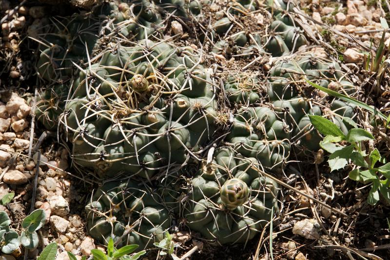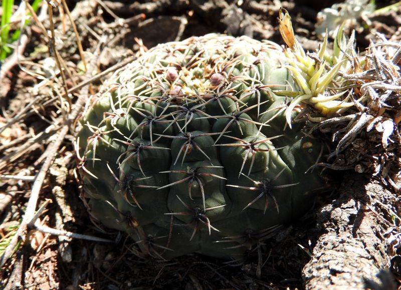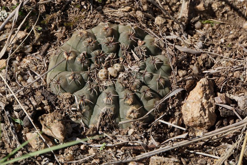 Hier bei Capilla sind die Rippen flacher und nicht so sehr in Höcker aufgelöst als bei den Populationen weiter im Süden. Meist sind 7 Randdornen vorhanden. Auch nimmt die Größe der Pflanzen von Süd nach Nord zu. Nicht zu unterschätzen ist auch die Verwechslungsgefahr bei der Abgrenzung zu Arten aus dem Verwandschaftskreis von G.calochlorum (nicht hier, aber im Süden bei Carlos Paz/Tanti durchaus).