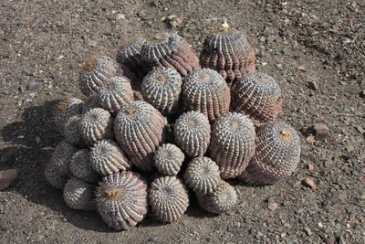 Es sind stattliche Copiapoen mit weißlich-grauer Bereifung; sie sind sehr gut an der orange-braunen Scheitelwolle (im Neutrieb) zu erkennen. Und es gibt ihn doch, den südamerikanischen Fero: „Ferocactus haseltonianus“ - 35 cm Durchmesser! Im südlichen Verbreitungs-Gebiet gibt es hohe und wenig verzweigte Pflanzen (im Buch COPIAPOA (1996) noch „gigantea“ genannt) Gigantisch (die Pflanze!