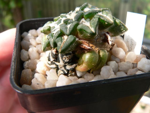 Hier mal das versprochene Bild. Der Ariocarpus (cv. 'Maruibo' x var. pectinatus) wurde als Sämling auf Selenicereus gepfropft. Später habe ich den Selenicereus ca. 2cm unterhalb des Pfröpflings abgeschnitten und neu bewurzelt. Mittlerweile hat er neben der Unterlage eine starke Rübenwurzel gebildet.