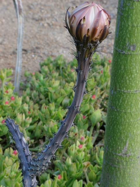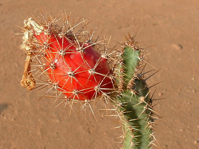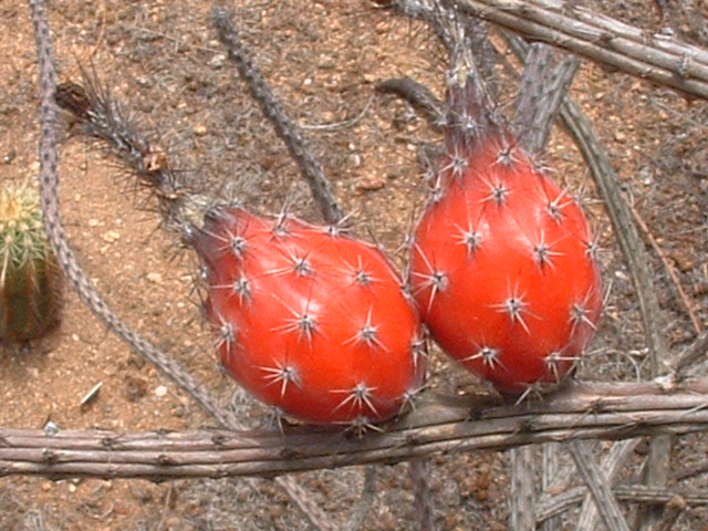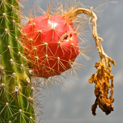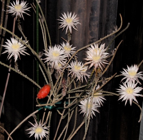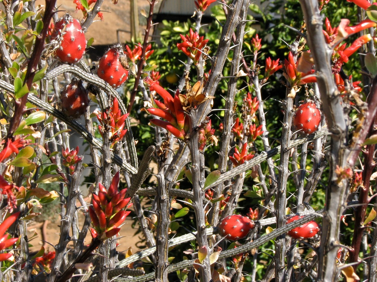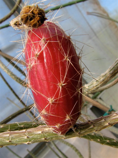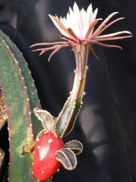 Und wo ich schon grade bei den Penios bin, hier nochmals Bilder vom Peniocereus diguetii, der inzwischen eine 3m hohe Fouquieria formosa 'bevölkert' und jedes Jahr im Frühherbst blüht und Mitte Dezember seine reifen Früchte zeigt.