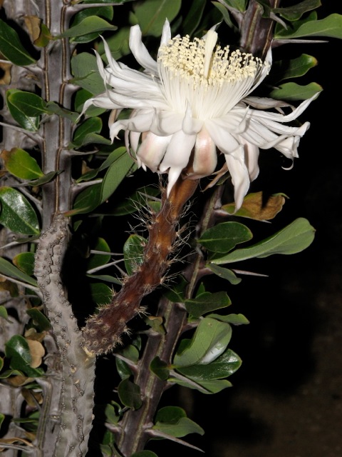 Wie der Name schon sagt Nyctocereus, ist es ein Nachtblüher, die wunderschönen weißen Blüten öffnen sich erst in der Dämmerung und verströmen einen zarten Duft.