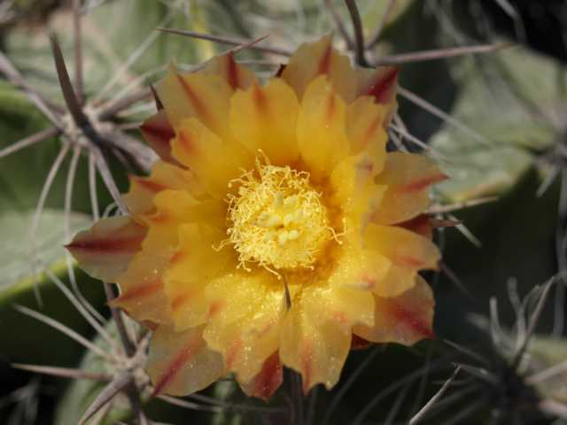 falls Du noch'n Bild brauchst, hier ist eines von einer Blüte, die irgendwie das Mittelding zwischen Manfredos Blüten darstellt Zu der Pflanze gibt's eine verblüffende Geschichte: jahrelang suchte ich im Internet und in Gärtnereien weltweit nach Fero flavovirens als Pflanze, schließlich wurde ich in England fündig und ließ mir 3 Pflanzen schicken. Große Enttäuschung... es waren Fero robustus ;-( Darauf angesprochen sagte der Lieferant 'haben wir aus Samen eines deutschen Händlers gezogen'. Egal, ich will keine Namen nennen, das kann ja mal passieren. Dann hörte ich, daß die Gärtnerei Western Cactus hier in Vista, CA die Art haben soll. Ein Angestellter bestätigte mir das und wollte danach suchen... Fehlanzeige, die großen, vielköpfigen Pflanzen waren nicht mehr zu finden. ;-(( Schließlich benachrichtigte mich der Fero-Guru G.Unger, daß Uhlig diese Art anbietet. Ich nahm sofort Kontakt auf, bestellte und erfuhr, daß diese Pflanzen, nun bewurzelte Einzelköpfe, aus einer Gärtnerei in Kalifornien stammten. Im Spätsommer '09 waren die Pflanzen hier