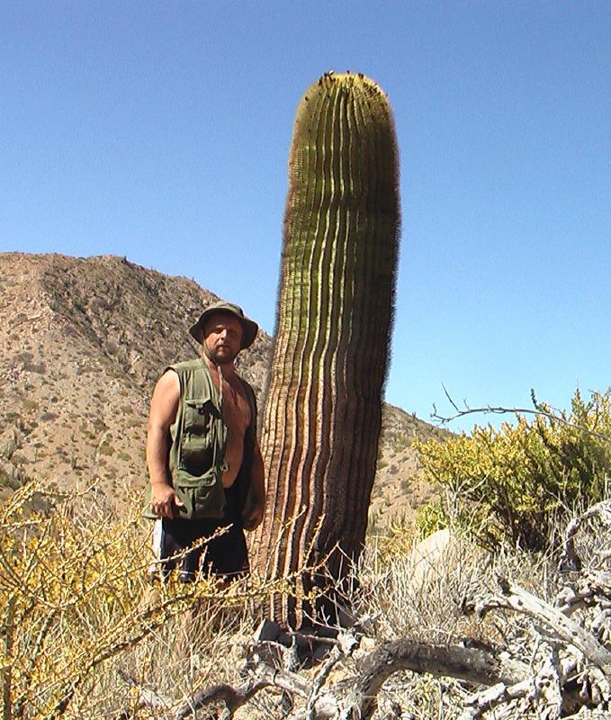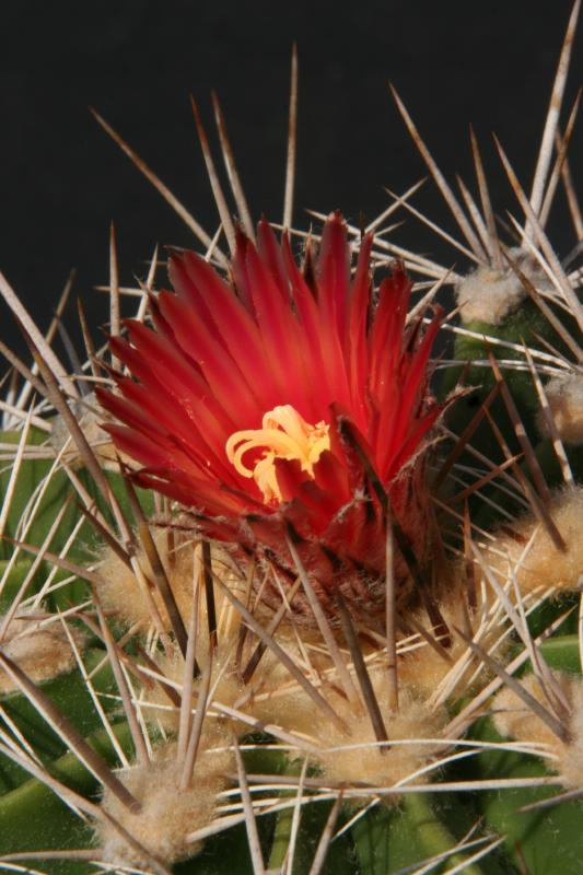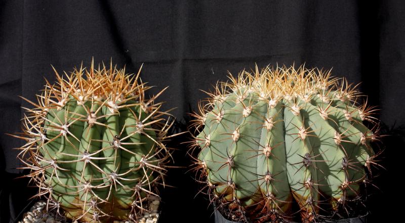 hier einmal die größte aller Ferokakteen-Arten: Feroc. diguetii und die kleiner bleibende Varietät carmenensis. Sie kommen auf wenigen Inseln im Golf von Kalifornien vor: Feroc. diguetii im wesentlichen auf den Inseln Santa Catlina und Cerralvo und die Varietät carmenensis ausschließlich auf der Insel Carmen. Auf Santa Catalina kann Feroc. diguetii eine Höhe von 5 Meter und einen Durchmesser von 60 bis 80 cm erreichen, auf Cerralvo bleibt er mit „nur“ 2,5 Meter deutlich kleiner. Feroc. diguetii var. carmenensis erreicht nur eine Höhe von ca. 1 Meter bei einem Durchmesser von 40 cm und ist in seiner Heimat (Isla Carmen) leider nicht mehr häufig zu finden. Er unterscheidet sich von seinem „großen Bruder“ durch die Größe, hat derbere Dornen und als „jüngere“ Pflanze eine kugelige Form - im Gegensatz zur mehr abgeflachten Form des F. diguetii. Feroc. diguetii ist hierzulande leider nicht sehr häufig zu finden. Die Varietät carmenensis gehört mit Feroc. acanthodes var. johnstonianus und lindsayi zu den „Ferokaktus-Raritäten“.