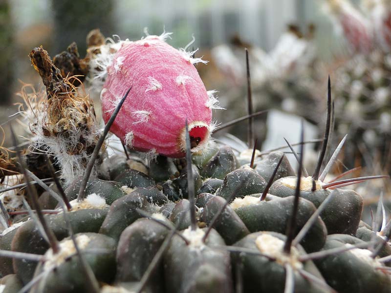 Bei Horridocactus bleibt die rote Beerenfrucht an der Pflanze bis sie durch mechanischische Einflüsse (Wind, Tiere, Menschen) abgekippt wird. Sie trocknet erst im folgenden Jahr ein.